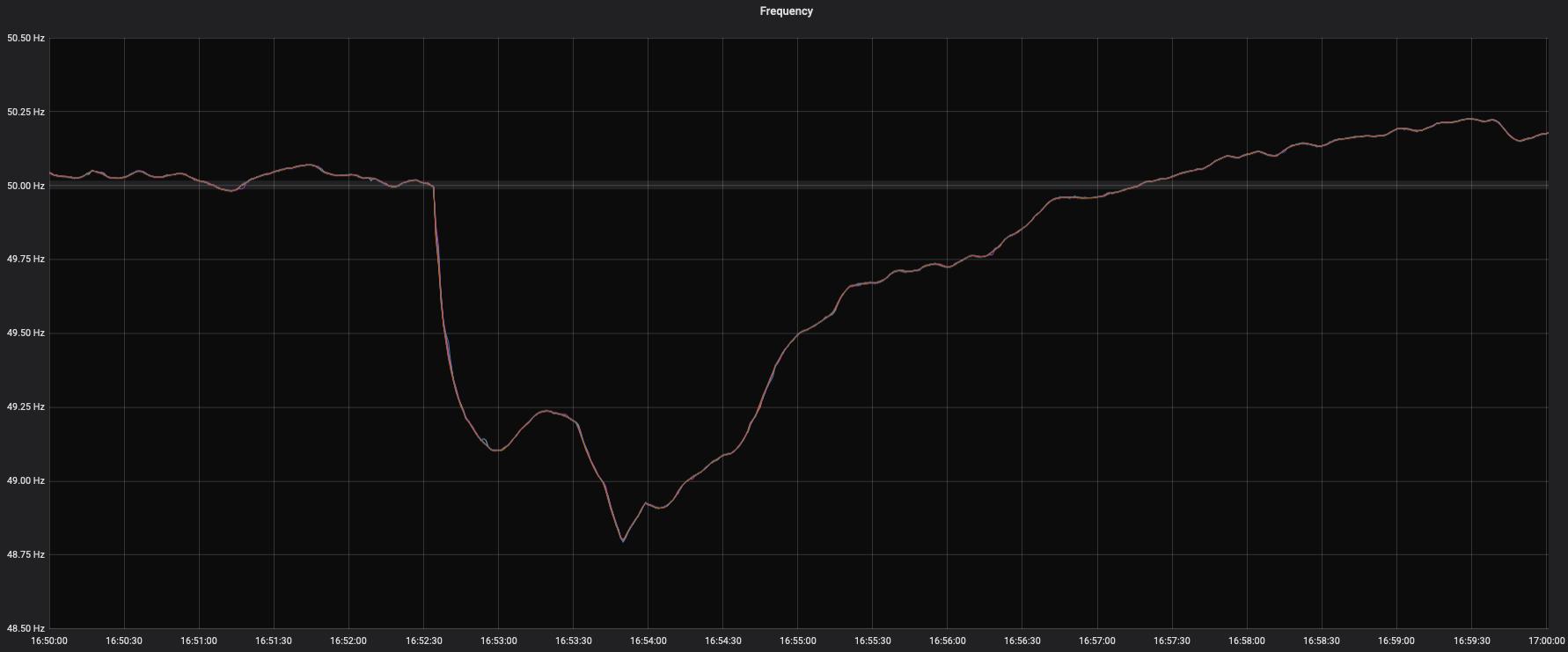 What my analysis did show was that these dips were unusual – there were over 600,000 data points in my spreadsheet but only 17 where the frequency was more than 0.75% below the 50 Hz level: